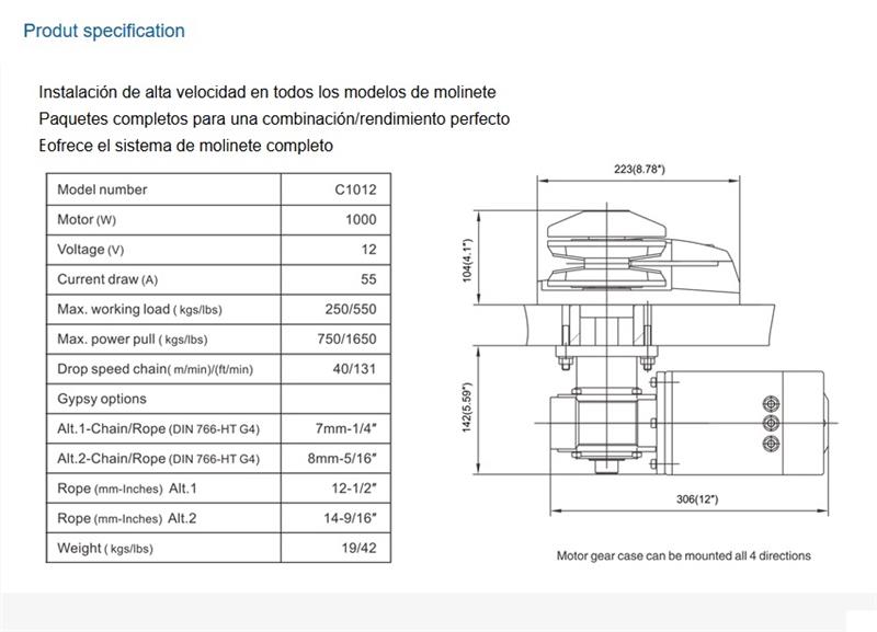 Con carcaza de acero inoxidable 316 altamente pulido (como las principales marcas del mundo Lewmar, Maxwell y Muir) más resistente al agua de mar y de mayor resistencia física. Funcionamiento suave y silencioso Potencia: 1200W Voltaje: 12 VDC Consumo: 85 Amp Max carga de trabajo: 400 kgs Max carga de tiro: 1100 kgs Velocidad de la línea en la carga de trabajo: 40 metros x minuto Velocidad máxima de la línea: 43 kgs Cadena DIN 766: 8 mm Cabo retorcido de: 14 mm Peso: 21.4 kgs INCLUYE Solenoide No incluido en otras marcas: - Llave térmica - Tablero subir y bajar wáter resistente - Botones de pie (2) - Manija para uso manual COSTANERA UNO SINONIMO DE NAUTICA Y DEPORTE