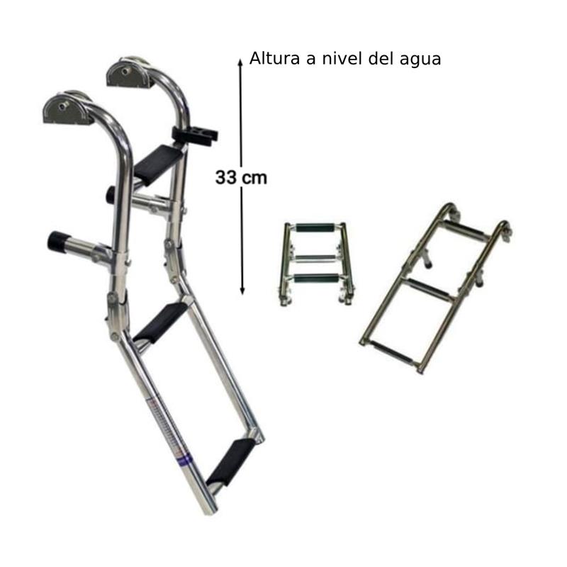 ESPECIALMENTE DISEÑADA PARA USAR EN POPAS ANGOSTAS NO TIENE ESCALONES PLASTICOS QUE SE QUIEBRAN CON EL TIEMPO PRODUCCIENDO ACCIDENTES SE PUEDE INSTALAR SOBRE CUBIERTA O SOBRE EL ESPEJO DE POPA Dimensiones: Ancho 22 cm Largo total: 60 cm Rebatida: 32 cm Escalera Plegable de 3 Escalones Totalmente de acero inoxidable pulido 304 Escalones de acero inoxidable con antideslizante Ventajas sobre la escalera de aluminio No se ponen lo caños negros con el tiempo, siempre conserva el brillo No se dobla con los golpes. No tiene escalones de plástico que se rompen con el tiempo, se pone amarillos y son dificiles de limpiar en los orificios ESCALERA PARA TODA LA VIDAn accidente.