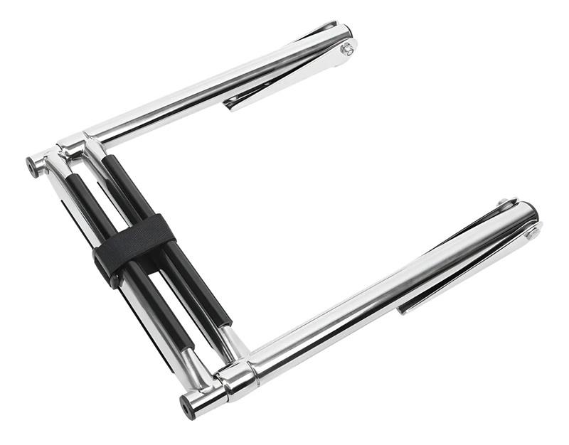 Escalera Telescopica sobre planchada 2 Esc Base 90x30 mm Escalera cerrada : 35cm de largo Extendida: 60 cm El objeto en la imagen es una escalera náutica telescópica o plegable, generalmente hecha de acero inoxidable para su uso en barcos Es un tipo de escalera diseñada para facilitar el acceso desde el agua a una embarcación o muelle. Su diseño plegable o telescópico permite guardarla de forma compacta cuando no está en uso.