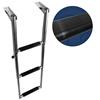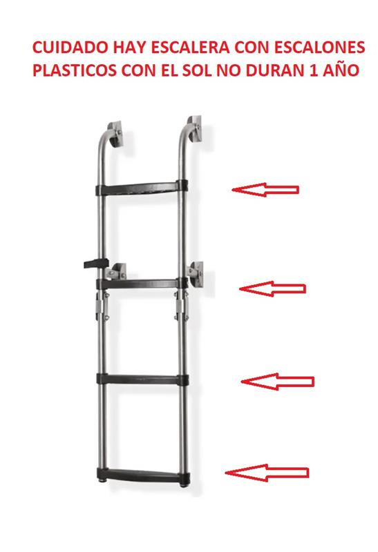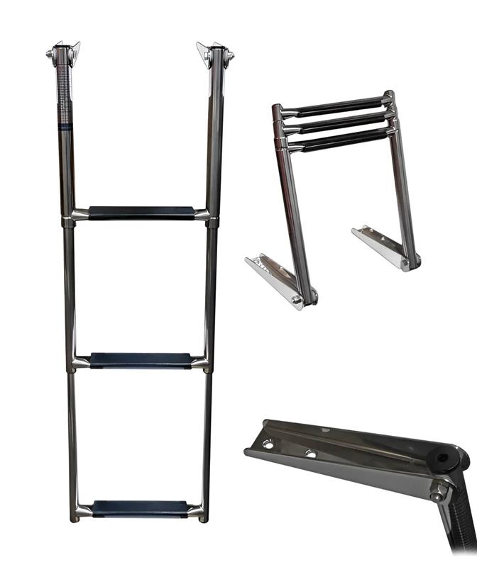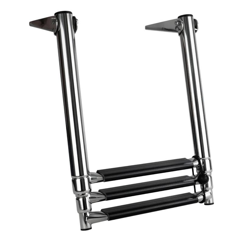 Escalera Telescopica sobre planchada 3 Esc 875-x375 Ancho 258 mm Base 150 mm Escalera esta fabricada en acero inoxidable pulido con escalones planos, cubiertos de PVC anti-deslizante negro y resistentes a los rayos UV. Se despliega en el agua de forma rápida y sin problemas para un uso seguro. Los escalones se pliegan de manera compacta y dan a la escalera una apariencia elegante. El cuerpo de la escalera es un tubo de acero inoxidable para una mayor durabilidad y resistencia a la corrosión.