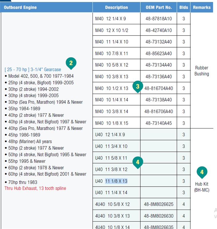 hélice CAPTAIN ideal para aguas claras sin obstáculos, dado que tiene baja resistencia a los golpes y no se puede reparar 25 - 70 hp ] 3-1/4” Gearcase • Model 402, 500, & 700 1977-1984 • 25hp (4 stroke, Bigfoot) 1999-2005 • 30hp (2 stroke) 1994-2002 • 30hp (4 stroke) 1999-2005 • 30hp (Sea Pro, Marathon) 1994 & Newer • 35hp 1984-1989 • 40hp (2 stroke) 1977 & Newer • 40hp (4 stroke, Not Bigfoot) 1997 & Newer • 40hp (Sea Pro, Marathon) 1977 & Newer • 45hp 1986-1989 • 48hp (Mariner) All years • 50hp (2 stroke) 1977 & Newer • 50hp (4 stroke, Not Bigfoot) 1995 & Newer • 55hp 1995 & Newer • 60hp (2 stroke) 1978 & Newer • 60hp (4 stroke, Not Bigfoot) 2001 & Newer • 70hp thru 1983 Thru Hub Exhaust, 13 tooth spline
