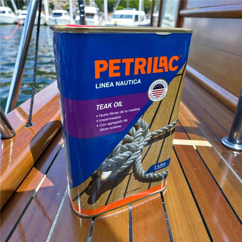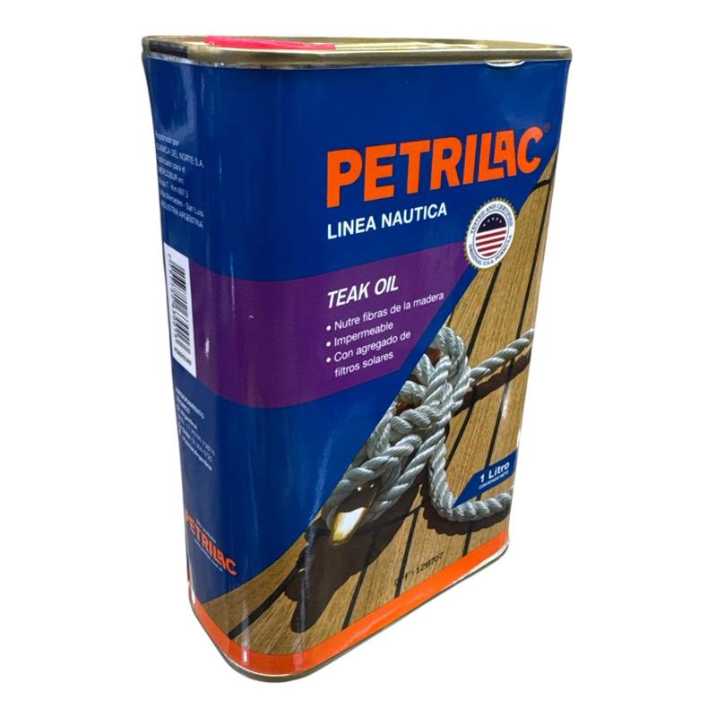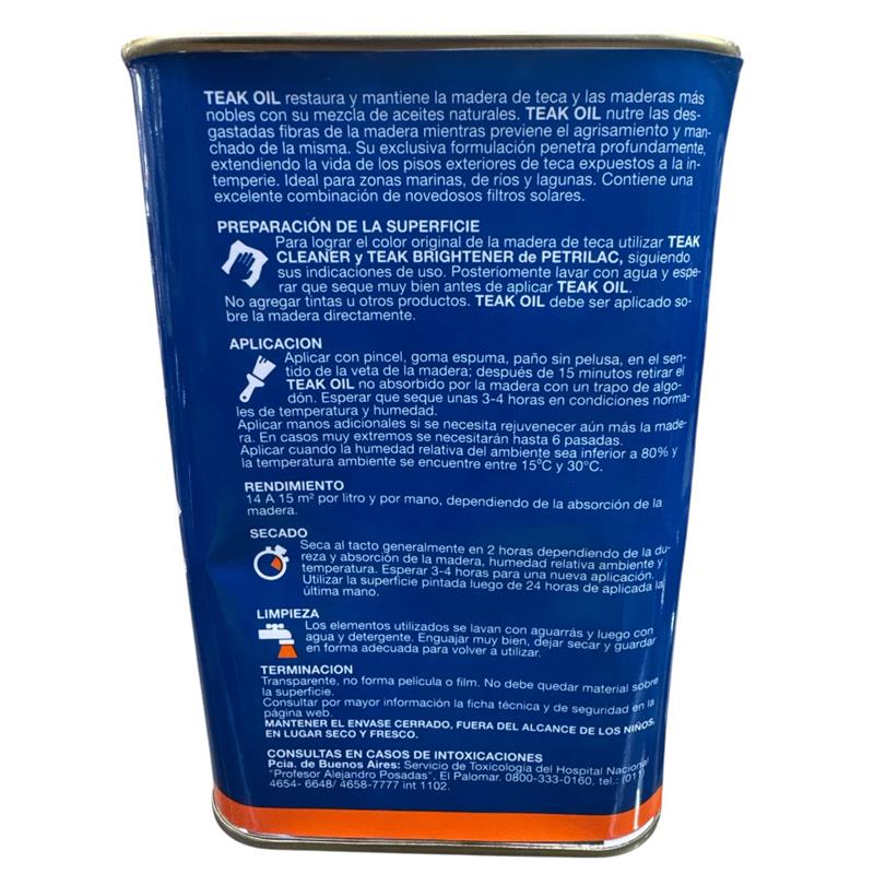 TEAK OIL restaura y mantiene la madera de teca y las maderas más nobles con su mezcla de aceites naturales. TEAK OIL nutre las desgastadas fibras de la madera mientras previene el agrisamiento y manchado de la misma. Su exclusiva formulación penetra profundamente, extendiendo la vida de los pisos exteriores de teca expuestos a la intemperie. Ideal para zonas marinas, de ríos y lagunas. Contiene una excelente combinación de novedosos filtros solares. Preparación de la superficie Para lograr el color original de la madera de teca utilizar TEAK CLEANER y TEAK BRIGHTENER de PETRILAC, siguiendo sus indicaciones de uso. Posteriomente lavar con agua y esperar que seque muy bien antes de aplicar TEAK OIL. No agregar tintas u otros productos. TEAK OIL debe ser aplicado sobre la madera directamente. Aplicación Aplicar con pincel, goma espuma, paño sin pelusa, en el sentido de la veta de la madera; después de 15 minutos retirar el TEAK OIL no absorbido por la madera con un trapo de algodón. Esperar que seque unas 3-4 horas en condiciones normales de temperatura y humedad. Aplicar manos adicionales si se necesita rejuvenecer aún más la madera. En casos muy extremos se necesitarán hasta 6 pasadas. Aplicar cuando la humedad relativa del ambiente sea inferior a 80% y la temperatura ambiente se encuentre entre 15°C y 30°C. CARACTERÍSTICAS RENDIMIENTO 14 A 15 m² por litro y por mano, dependiendo de la absorción de la madera. SECADO Seca al tacto generalmente en 2 horas dependiendo de la dureza y absorción de la madera, humedad relativa ambiente y temperatura. Esperar 3-4 horas para una nueva aplicación. Utilizar la superficie pintada luego de 24 horas de aplicada la última mano. LIMPIEZA Los elementos utilizados se lavan con aguarrás y luego con agua y detergente. Enguajar muy bien, dejar secar y guardar en forma adecuada para volver a utilizar. TERMINACION Transparente, no forma película o film. No debe quedar material sobre la superficie. PRESENTACION 1 litro
