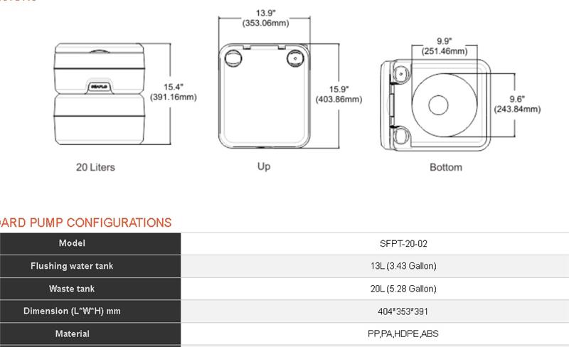 El inodoro portátil SEAFLO está diseñado para uso móvil , como campamentos, paseos en bote, caravanas, cabañas , médicos, niños, hogar, emergencias, etc. Tiene una construcción de alta calidad y lo hace fuerte y duradero. Su diseño liviano hace que sea fácil de transportar y colocar en cualquier lugar. Ligero y duradero . Diseño compacto para un fácil almacenamiento y transporte . Asiento grande y cómodo, fácil de usar y fácil de mantener . No se requieren conexiones externas de agua o energía . Marca Seaflo la misma que fabrica las bombas y los inodoros eléctricos El inodoro portátil SEAFLO está diseñado para uso móvil , como campamentos, paseos en bote, caravanas, cabañas , médicos, niños, hogar, emergencias, etc. Tiene una construcción de alta calidad y lo hace fuerte y duradero. Su diseño liviano hace que sea fácil de transportar y colocar en cualquier lugar. Peso ligero y duradero . Diseño compacto para un fácil almacenamiento y transporte . Asiento grande y cómodo, fácil de usar, fácil de mantener . No se requieren conexiones externas de agua o energía . CARACTERÍSTICAS Y BENEFICIOS 1. Ideal para Marina, RV y camping. 2. Totalmente autónomo. 3. La válvula sellada mantiene los olores en el tanque. 4. Asa de transporte ergonómica. 5. Vertedor con pico de descarga. 6. Plástico moldeado ABS duradero. 7. Dimensiones: Altura 391 x Ancho 353 x Profundidad 403 mm 8. Tanque superior 13 litros 9. Tanque inferior 20 litros 10. Material PP PA HDPE ABS
