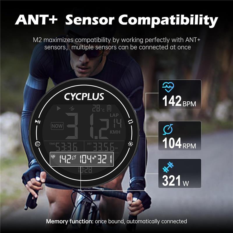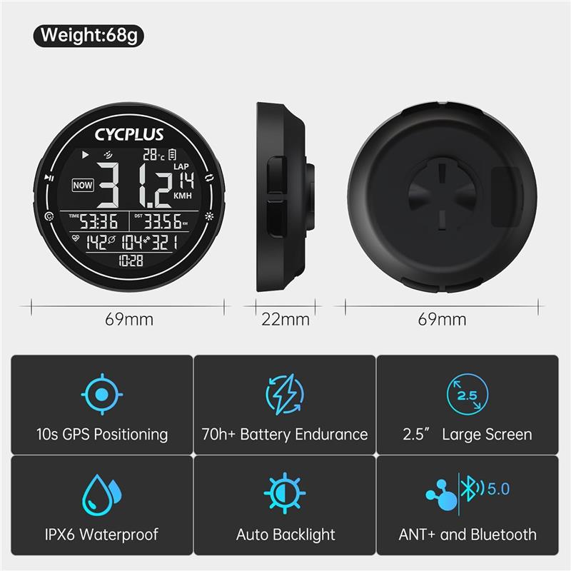 El Ciclocomputador GPS M2 de Cycplus es un dispositivo diseñado para los amantes del ciclismo. Este dispositivo te permite llevar un registro de tus tiempos, vueltas recorridas, velocidades máximas y medias, altitud, odómetro y más parámetros. Con una pantalla de 2,5", podrás visualizar todos estos datos de manera clara y sencilla. Este ciclocomputador es resistente a la intemperie y puede soportar condiciones climáticas adversas gracias a su resistencia IPX6. Puedes usarlo de manera continua durante 35 horas y es capaz de almacenar hasta 150 horas de datos. Especificaciones Técnicas: Tamaño de pantalla: 2.5” Modo de Carga: USB Tipo C Dimensiones: 70 * 70 * 21.5 mm Peso: 69 gr Batería: 1000 mAH 3.7 V Tiempo de carga: 2.5 hs aprox. Conexión: ANT+, BT 5.0 FUNCIONES Medición: - Velocidad Actual - Velocidad Media - Velocidad Máxima - Odómetro - Pendiente - Altitud - Tiempo de Conducción - Vueltas recorridas - Temperatura Visualización - Reloj Incorporado - Brillo Automático de la Pantalla Incluye: Ciclocomputador M2, Soporte para bicicleta, Disco de goma, 3 bandas elasticas, Cable USB Tipo C y Manual de uso.
